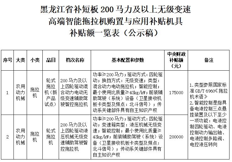 关于《黑龙江省补短板200马力及以上无级变速高端智能拖拉机购置与应用补贴机具补贴额一览表》的公示